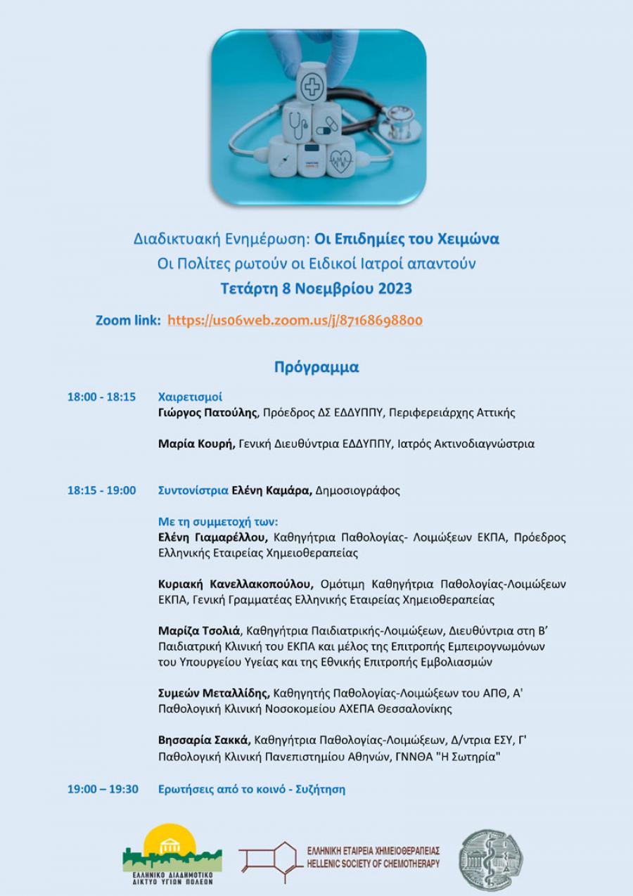 Το ΚΕΠ ΥΓΕΙΑΣ του Δήμου Βέροιας σας προσκαλεί να συμμετάσχετε, στη διαδικτυακή ενημέρωση του Ελληνικού Διαδημοτικού Δικτύου Υγιών Πόλεων του Π.Ο.Υ. με τίτλο: “Οι Επιδημίες του Χειμώνα, - Οι Πολίτες ρωτούν, οι Ειδικοί Ιατροί απαντούν”,η οποία πραγματοποιείται με τη συνεργασία τηςΕλληνικής Εταιρείας Χημειοθεραπείας και τον Ιατρικό Σύλλογο Αθηνών.