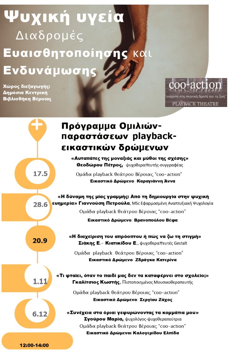 Μια ολοκληρωμένη ματιά σε καίρια ζητήματα ψυχικής υγείας, μέσα από επιστημονική προσέγγιση αλλά και βιωματικές δράσεις. Συγκεκριμένα «εργαλεία» και συμβουλές, που μπορείτε να εφαρμόσετε στην καθημερινότητά σας, ώστε να ενισχύσετε την ψυχική σας ανθεκτικότητα και να υποστηρίξετε καλύτερα τους ανθρώπους γύρω σας. Την ευκαιρία να μοιραστείτε δικές σας σκέψεις, ανησυχίες ή προσωπικές ιστορίες, σε έναν ασφαλή χώρο έκφρασης, όπου προσφέρεται χώρος για να ακουστεί η κάθε φωνή. Μια ανεκτίμητη εμπειρία γνωριμίας με μια μορφή τέχνης που αντλεί δύναμη από τη δυναμική της ίδιας της ζωής.