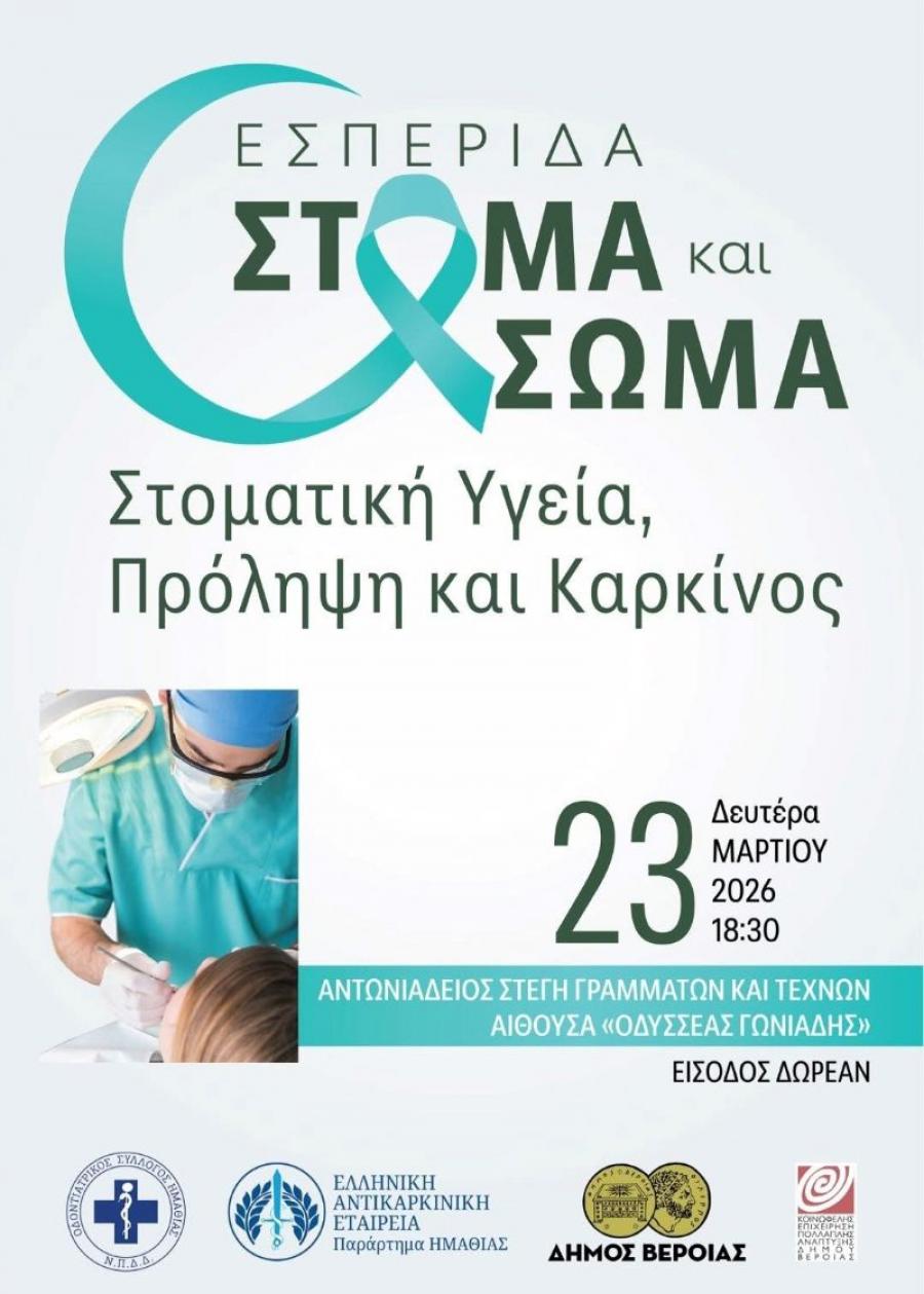 Μια ιδιαίτερα σημαντική ενημερωτική εκδήλωση με θέμα «Στόμα και Σώμα: Στοματική Υγεία, Πρόληψη και Καρκίνος» διοργανώνεται στη Βέροια, με στόχο την ευαισθητοποίηση του κοινού γύρω από ζητήματα πρόληψης και έγκαιρης διάγνωσης.